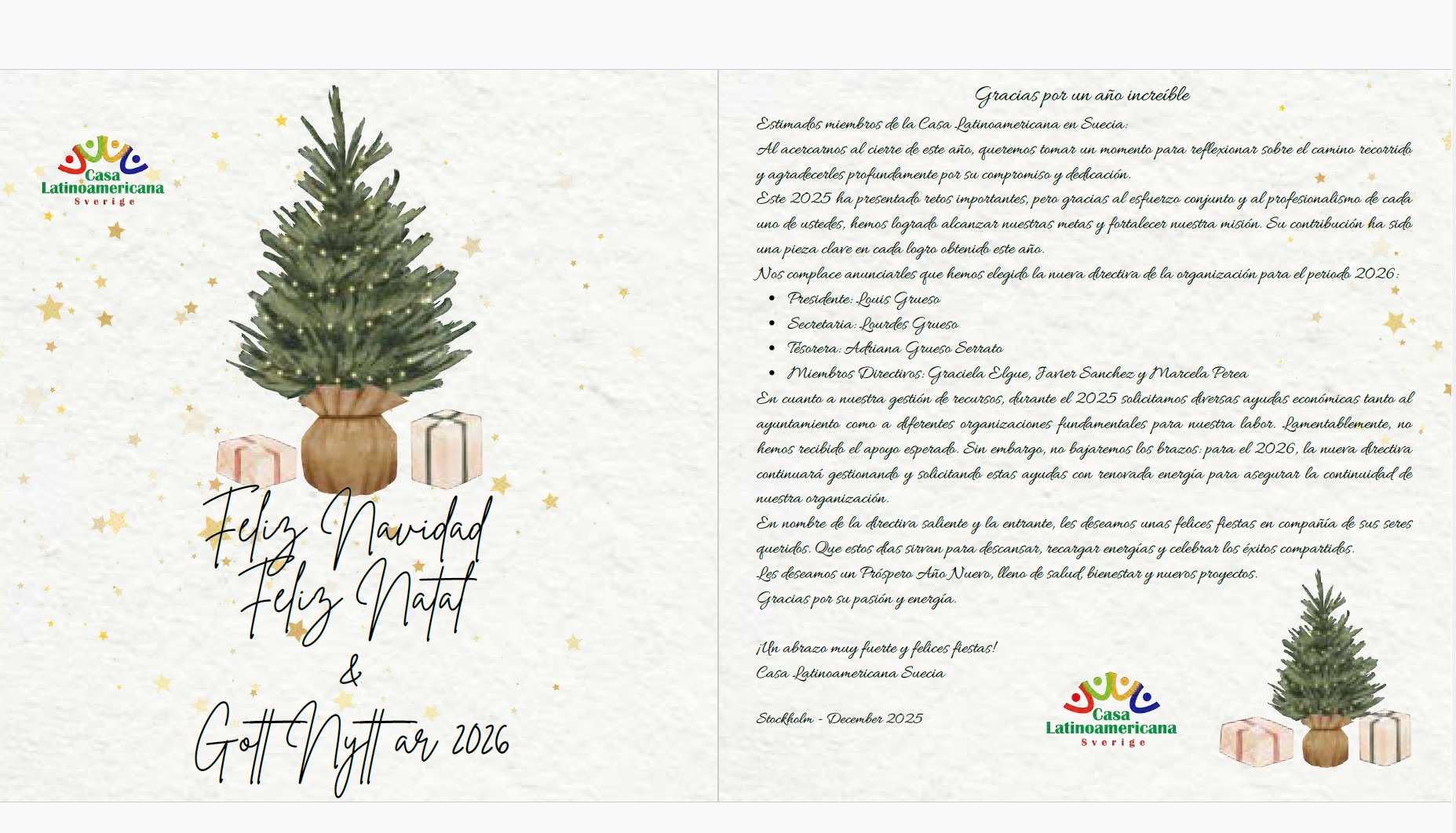 Casa Latinoamericana en Suecia es un centro social y cultural cuyo principal objetivo es trabajar activamente para mantener vivo el conocimiento del patrimonio cultural y artístico de toda América Latina. Su función es enriquecer la vida cultural sueca consolidando nuestra presencia y difundiendo nuestras tradiciones con el objetivo de tender puentes de entendimiento entre Suecia y América Latina. Casa Latinoamericana ofrece la oportunidad a cualquier persona que esté relacionada o tenga interés en la cultura latinoamericana de llevar realizamos proyectos y actividades que reflejan nuestra gran variedad y riqueza cultural, promoviendo así la necesidad de mantener vivas las tradiciones latinoamericanas en Suecia.